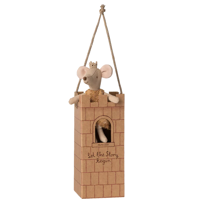 A real princess mouse in a big sister size. She is dressed up in her best dress with beautiful details and a golden crown. She fits perfectly into the Maileg castle.