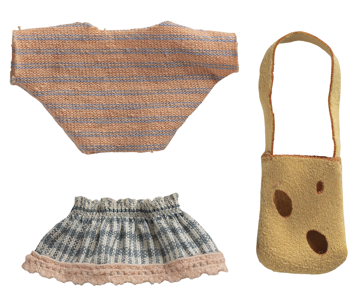 A little sister mouse beautiful dressed up for a playful day. She wears a small cheese bag for all her personal belongings and has magnets in hands. Add extra accessories and furniture to extend the play and storytelling about this new friend.